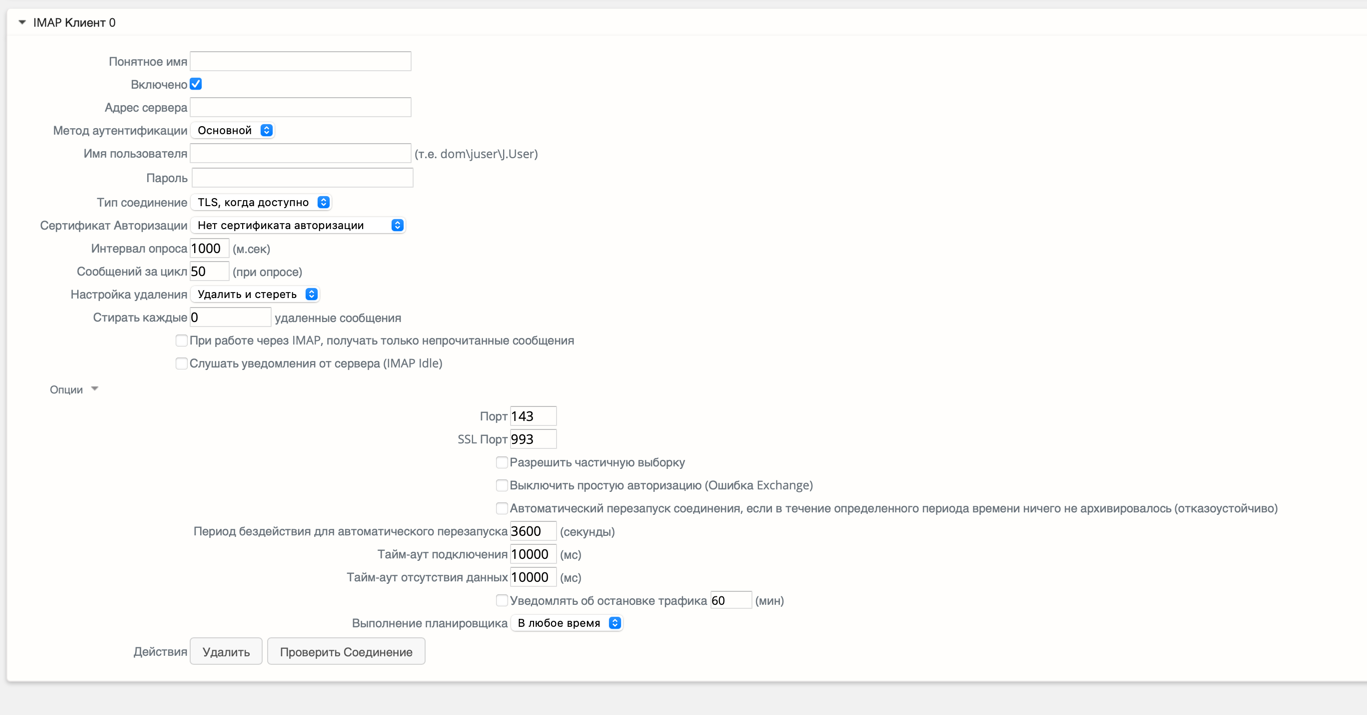 Интервал опроса | 50 msec | Когда IMAP Idle отключена, АРХИВА будет опрашивать почтовый сервер непрерывно для извлечения вновь прибывших сообщений. IMAP клиент загружает максимум сообщений настроенное в " максимальное количество сообщений ". Интервал опроса ожидания определяет, как часто АРХИВА должны ждатт до следующего опроса. Чем больше интервал опроса тем меньше сетевой трафик, меньший интервал опроса увеличивает скорость, с которой сообщения электронной почты будут обработаны и удалены из журнального ящика. |