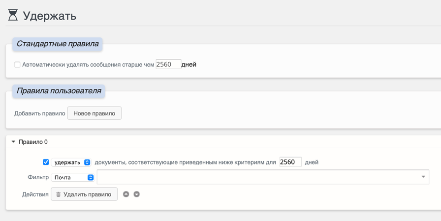 удержаниемстоит вышеудаления, то оно применится раньше, даже если ниже есть правило на удаление.Правило по умолчанию: Если ни одно правило не сработало, можно задать стандартный срок, после которого письма будут удалены.